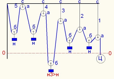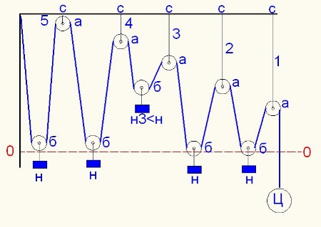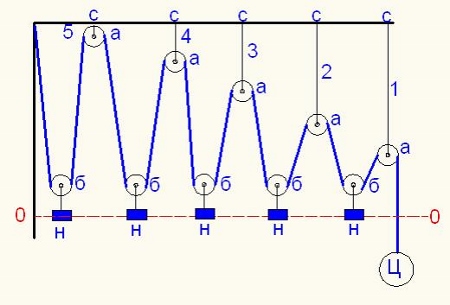 На этой схеме подвижные блоки «б» – это стояки, обладающие определенным гидравлическим сопротивлением (нагрузка «н»).Неподвижные блоки «а» с подвесными конструкциями – это балансировочные клапаны стояков. Каждый из неподвижных блоков имеет свою длину подвески, соответствующую значению настройки балансировочного клапана. Чем ближе стояк расположен к циркуляционному насосу «Ц», тем большим гидравлическим сопротивлением обладает балансировочный клапан. Совокупность стояковых гидравлических нагрузок компенсирует (уравновешивает) циркуляционный насос «Ц». Линия «0–0» является осью проектной циркуляции. То есть все стояки сбалансированы,и в каждом обеспечена проектная циркуляция теплоносителя. Именно такого положения добиваются монтажники отопительных систем в процессе сложных пусконаладочных работ. Если нагрузка стояка «н» окажется выше оси 0–0, то циркуляция в этом стояке увеличится, а если ниже – уменьшится.