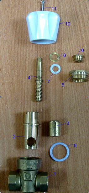 Кран VT.004 состоит из следующих деталей (рис. 13, 14) В латунном никелированном корпусе 1 (CW617N) помещается полая цилиндрическая пробка монтажной настройки 2. Внутри пробки может перемещаться цилиндрический шибер пользовательской настройки 3, соединенный со штоком 4 червяной передачей. Пробка монтажной настройки фиксируется прижимной гайкой 5 через тефлоновую шайбу 9. Штокуплотнен сальниковым кольцом из тефлона 7 с распределительной шайбой 8 и сальниковой гайкой 6. Детали 2, 3, 4, 5, 6 и 8 изготовлены из латуни CW614N. Ручка управления 10 из пластика ABS крепится к штоку с помощью оцинкованного винта 11.