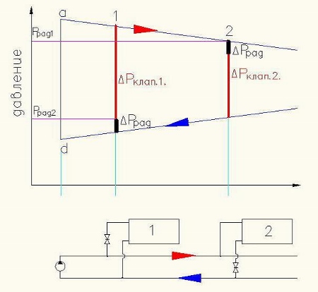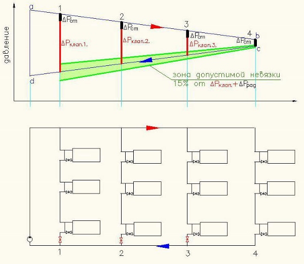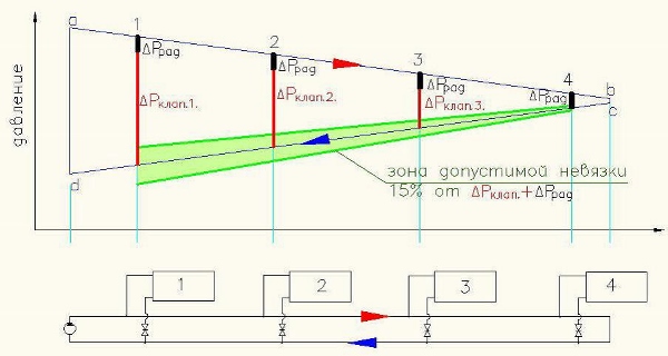 На горизонтальной ветви расположено четыре одинаковых радиаторных узла. На участке графика «a–b» отражено падение давления в подающей магистрали, на участке «с–d» – в обратной магистрали. Участок «d–a» показывает работу циркуляционного насоса, компенсирующего гидравлические потери в расчетном циркуляционном кольце. Потери давления в радиаторе и подводках к прибору обозначены участками ΔРрад. Для уравнивания давлений в тройниках используются настроечные клапаны, каждый из которых настроен так, чтобы обеспечить расчетный перепад давлений ΔРклап. Допустимая невязка в давлениях магистрали и радиаторной подводке не должна превышать 15 % от общих расчетных потерь давления врадиаторном узле.