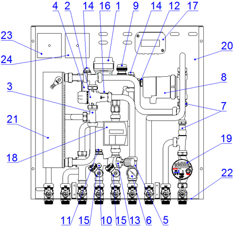 Поэлементное устройство станции VALTEC Control SAT показано на рис. 4. Как видно из рисунка, станция оснащена всеми необходимыми элементами для обеспечения комфортного и надежного тепло- и водоснабжения.