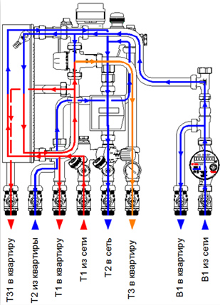- холодная вода на входе в станцию разделяется на два потока, один идет на нужды квартиры в холодной воде, а второй – в теплообменник для последующего нагрева;