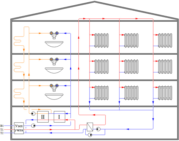 Рис. 11. Типовая схема тепло- и водоснабжения жилого здания