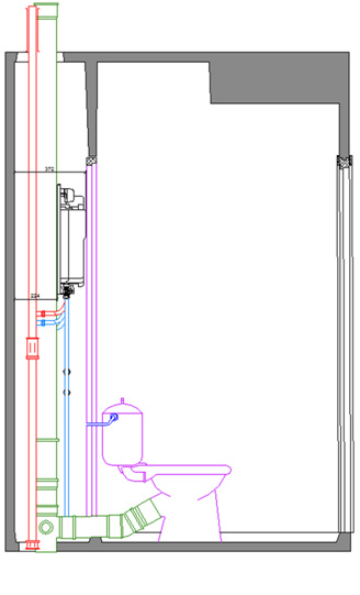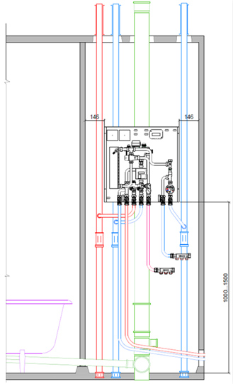 ![]() Рис. 14. Размещение квартирной станции в сантехкабине (вид спереди)