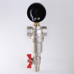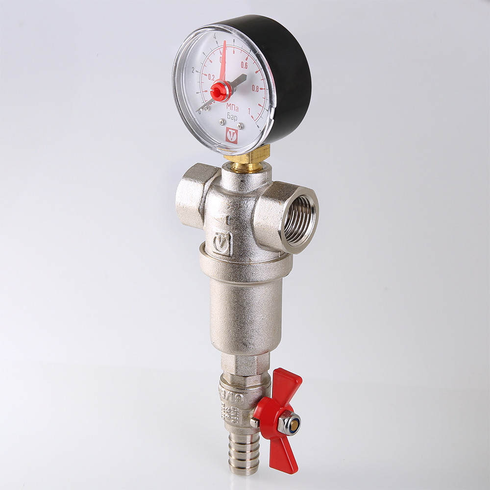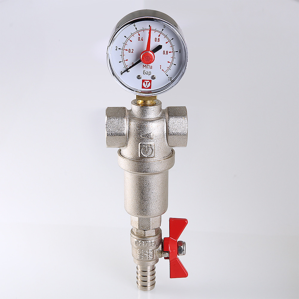 (VT.390.N) Компактный фильтр механической очистки воды с возможностью удаления накопившихся загрязнений без извлечения сетчатых вставок (промывной фильтр). Оснащен двумя (один в другом) фильтроэлементами из нержавеющей стали. Размер ячеек сетки первичного фильтроэлемента – 500, вторичного – 100 мкм. Корпус и колба фильтра выполнены из латуни марки CW617N (европейский стандарт EN 12165), никелированы. Предусмотрены дренажный шаровой кран со штуцером для подключения шланга и манометр для контроля уровня загрязненности сеток. Фильтр монтируется в вертикальном положении, колбой вниз. Резьба присоединений – внутренняя.