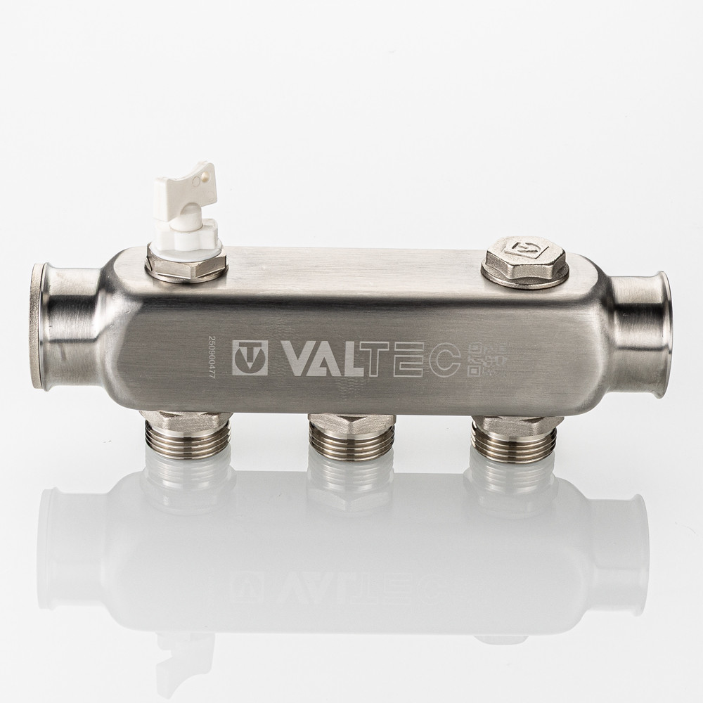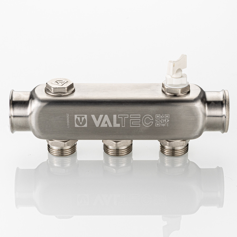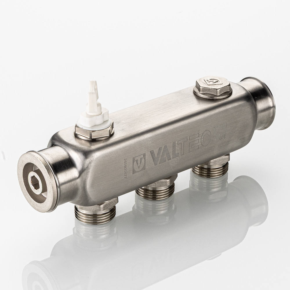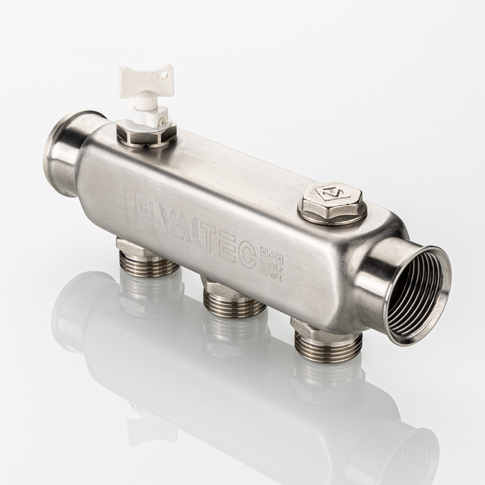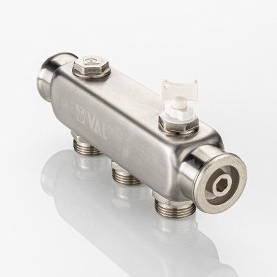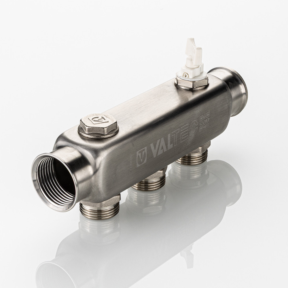 Коллектор из нержавеющей стали для распределения потоков жидкостей в контурах теплого пола, радиаторного отопления, холодного и горячего водоснабжения.