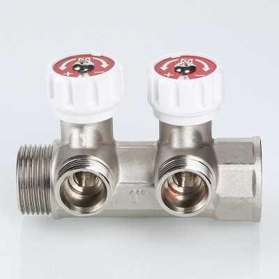 Латунный никелированный коллектор c выходами 3/4", «евроконус» (резьба – наружная). На каждом выходе предусмотрен вентиль для регулирования расхода рабочей среды. Диаметр коллектора – 1", резьба – внутренняя/наружная.