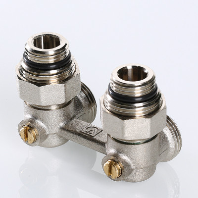 Особенность узла – угловое расположение относительно друг друга патрубков присоединения к отопительному прибору и трубной разводке. Это, в частности, упрощает так называемое тыльное подключение отопительного прибора – при скрытых в стене подводящих трубах.