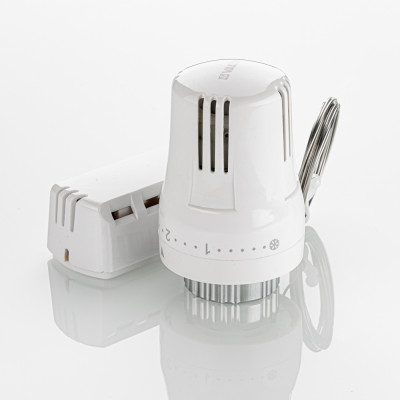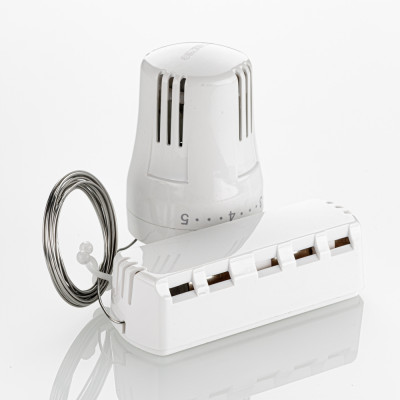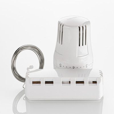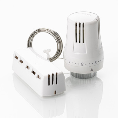 Жидкостная термостатическая головка с настенным датчиком предназначена для поддержания в помещении требуемой температуры воздуха путём регулирования расхода теплоносителя через отопительный прибор. Термочувствительный элемент предназначен для настенного крепления и соединен с термоголовкой капиллярной трубкой. Данное решение применяется в тех случаях, когда термоголовка установлена за плотной шторой, в нише, за экраном и температура воздуха вокруг неё не соответствует средней температуре воздуха в помещении.