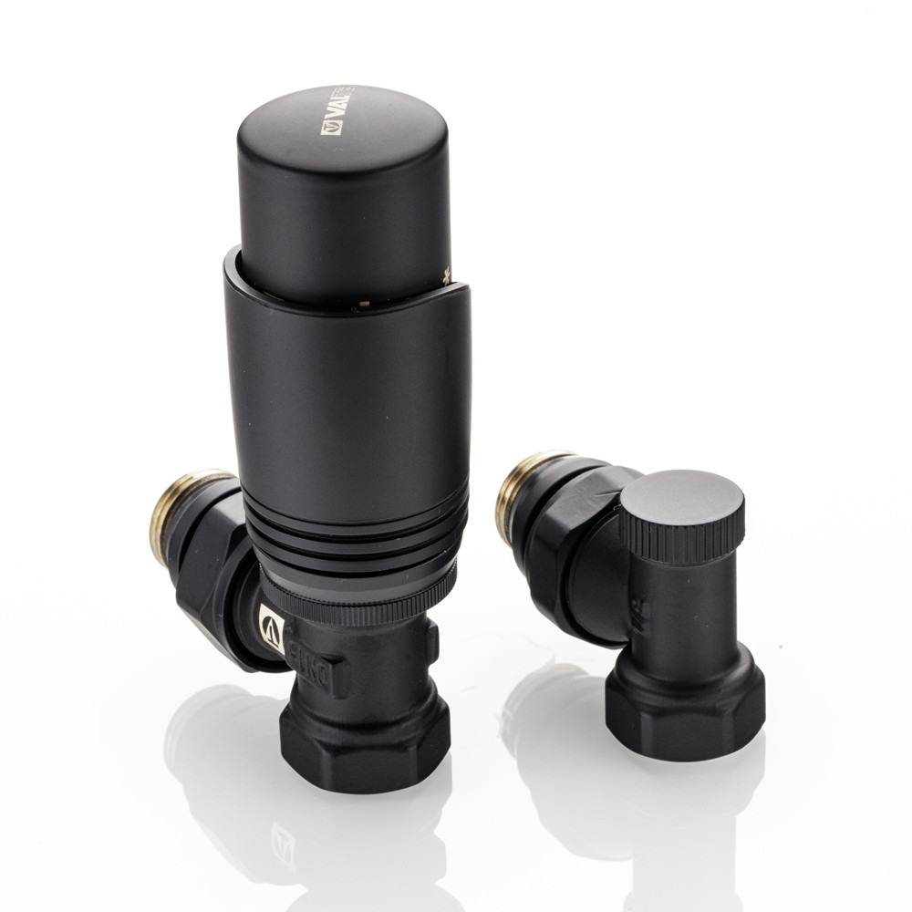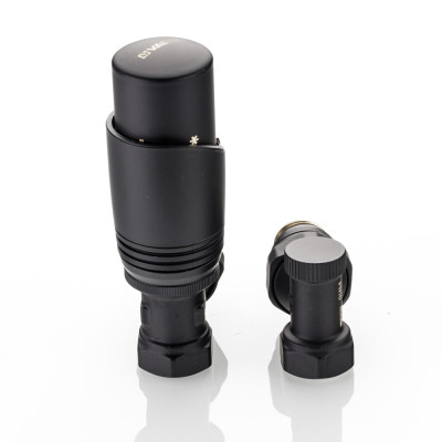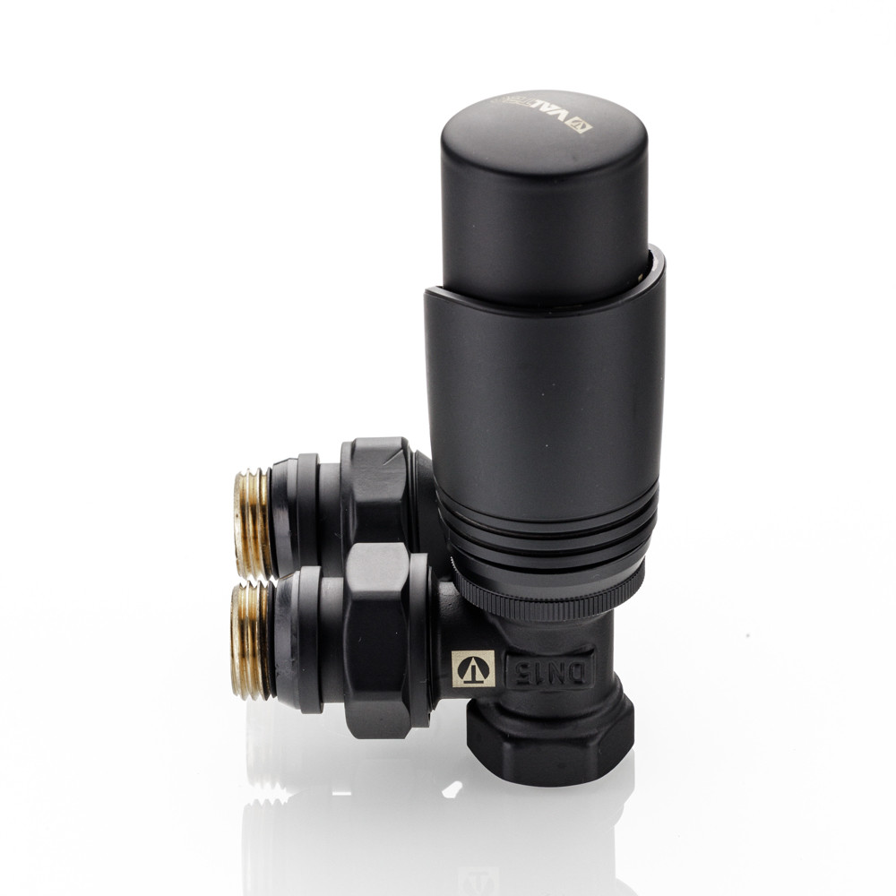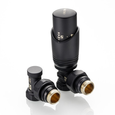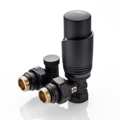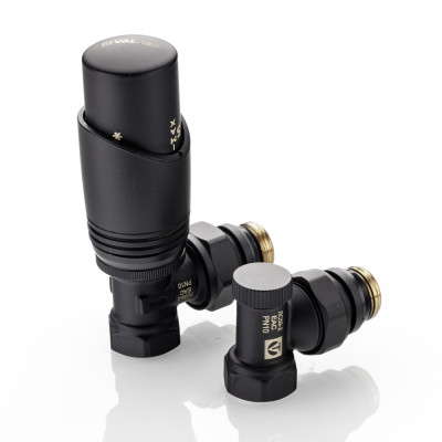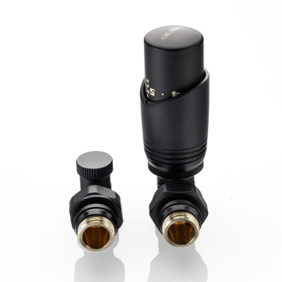 Клапаны и термоголовка комплекта выполнены в черном цвете.