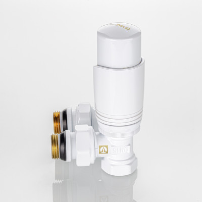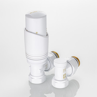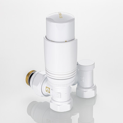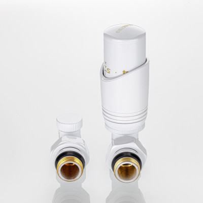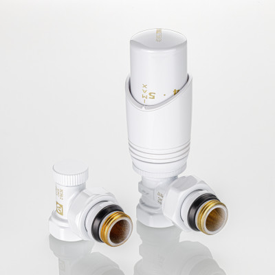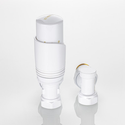 Клапаны и термоголовка комплекта выполнены в белом цвете.
