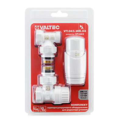 Набор предназначен для поддержания в помещении требуемой температуры воздуха путём регулирования расхода теплоносителя через отопительный прибор, а также для его гидравлической увязки. Комплект помещен в пылевлагозащитную упаковку (блистер).