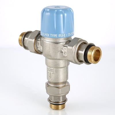 Трехходовой термостатический смесительный клапан с изменяемой в диапазоне от 30 до 50 °C настройкой. Предназначен для автоматического поддержания заданной температуры в системе горячего водоснабжения. Ее превышение исключается даже при полном отключении холодной воды, что позволяет использовать смеситель в школах, детских садах, других общественных зданиях. Термостат оперативно реагирует на изменение температуры и давления входящих потоков. Клапан выполнен из качественной латуни, никелирован. Встроенный термочувствительный элемент – твердотельный (армопарафин). Патрубки клапана соединены накидными гайками с полусгонами. Резьба присоединений – внешняя. Входы смесителя комплектуются обратными клапанами из нейлона. Максимальная температура на входе горячей воды – 90 °C, допустимое рабочее давление входных потоков – до 10 бар.
