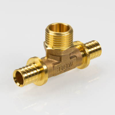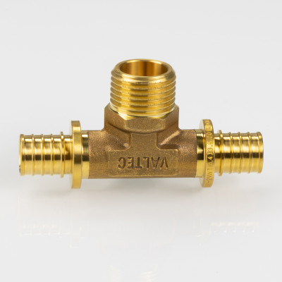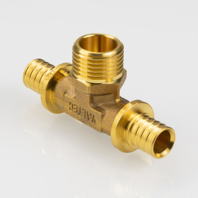 VTm.433.G – трехсторонний латунный аксиальный фитинг с переходом на наружную резьбу в центральном отводе (тройник надвижной с переходом на наружную резьбу), обеспечивающий присоединение к полимерному трубопроводу элемента системы с резьбовым патрубком.