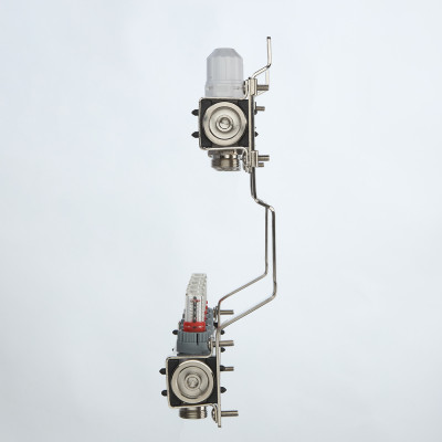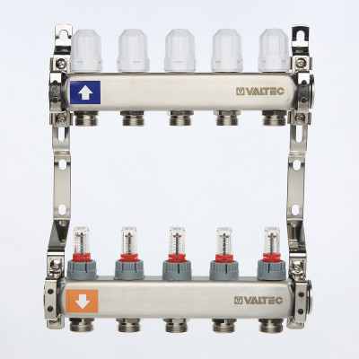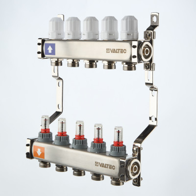 Выходы обратного коллектора блока VTс.579 оборудованы регулирующими клапанами с возможностью установки электротермических сервоприводов, подающего – настроечными клапанами с расходомерами (ротаметрами). В комплект входит пара сдвоенных кронштейнов с двумя комплектами хомутов.