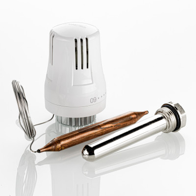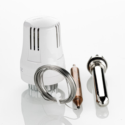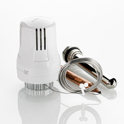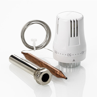 Жидкостная термостатическая головка с выносным погружным датчиком предназначена для поддержания требуемой температуры теплоносителя путём регулирования его расхода через термостатический клапан (двух- или трехходовой). Выносной датчик соединен с термоголовкой капиллярной трубкой. Датчик устанавливают в латунную гильзу (входит в компл. поставки) с наружной резьбой 1/2". Заданное значение температуры устанавливается в диапазоне от 20 до 60 °С. Присоединение термоголовки к клапану осуществляется с помощью накидной гайки с резьбой М30 х 1,5. Длина капиллярной трубки 2 м.