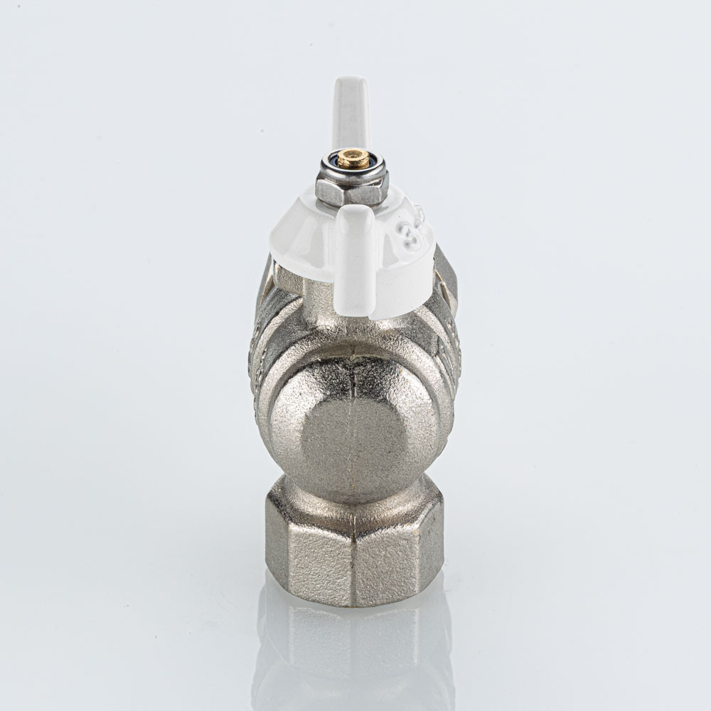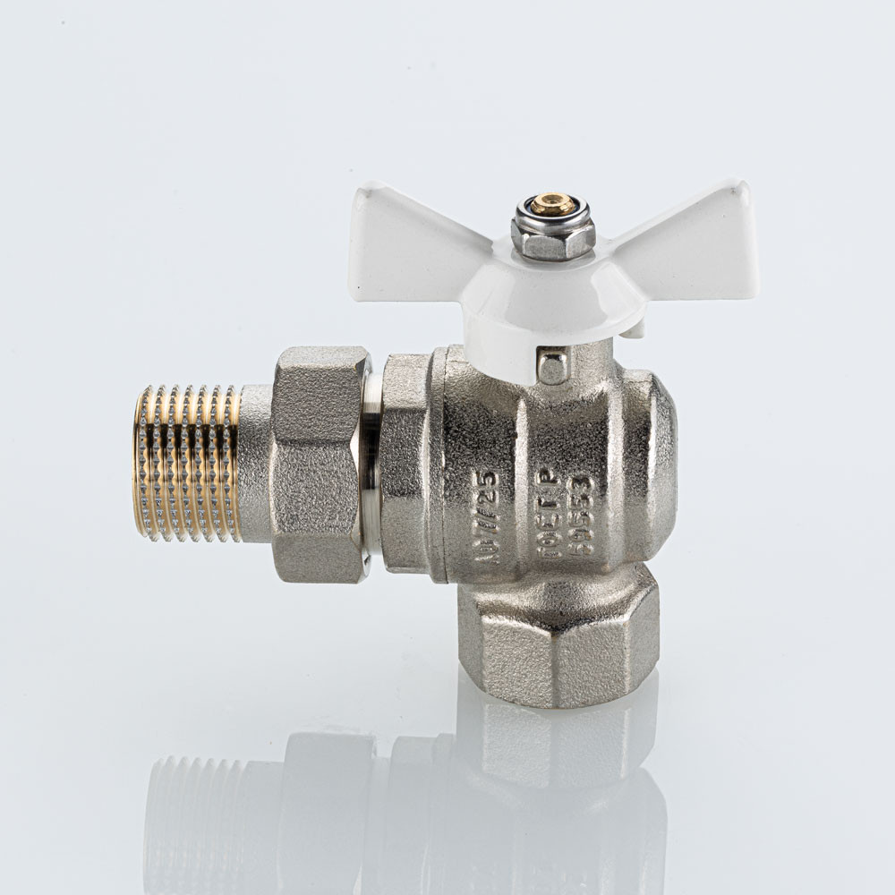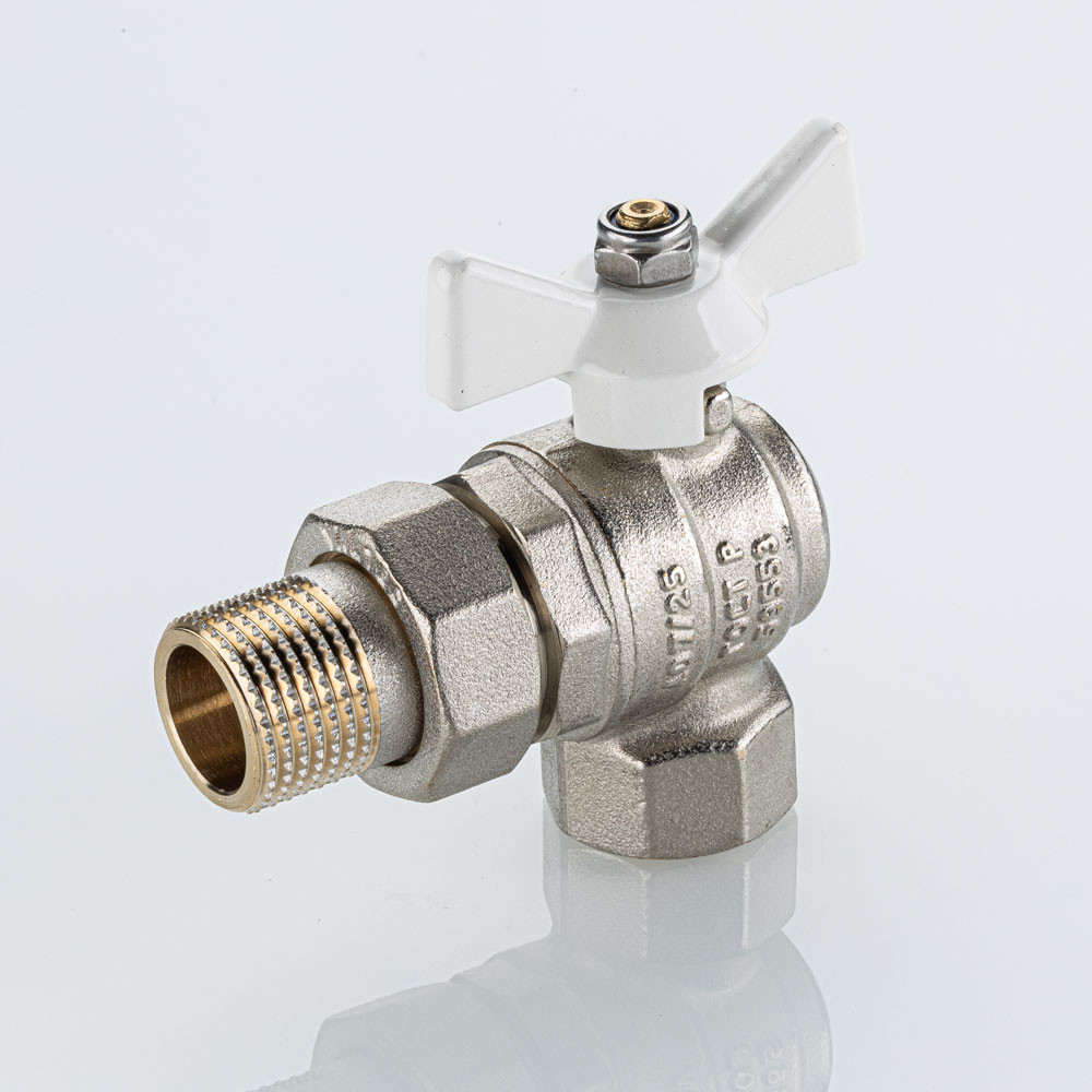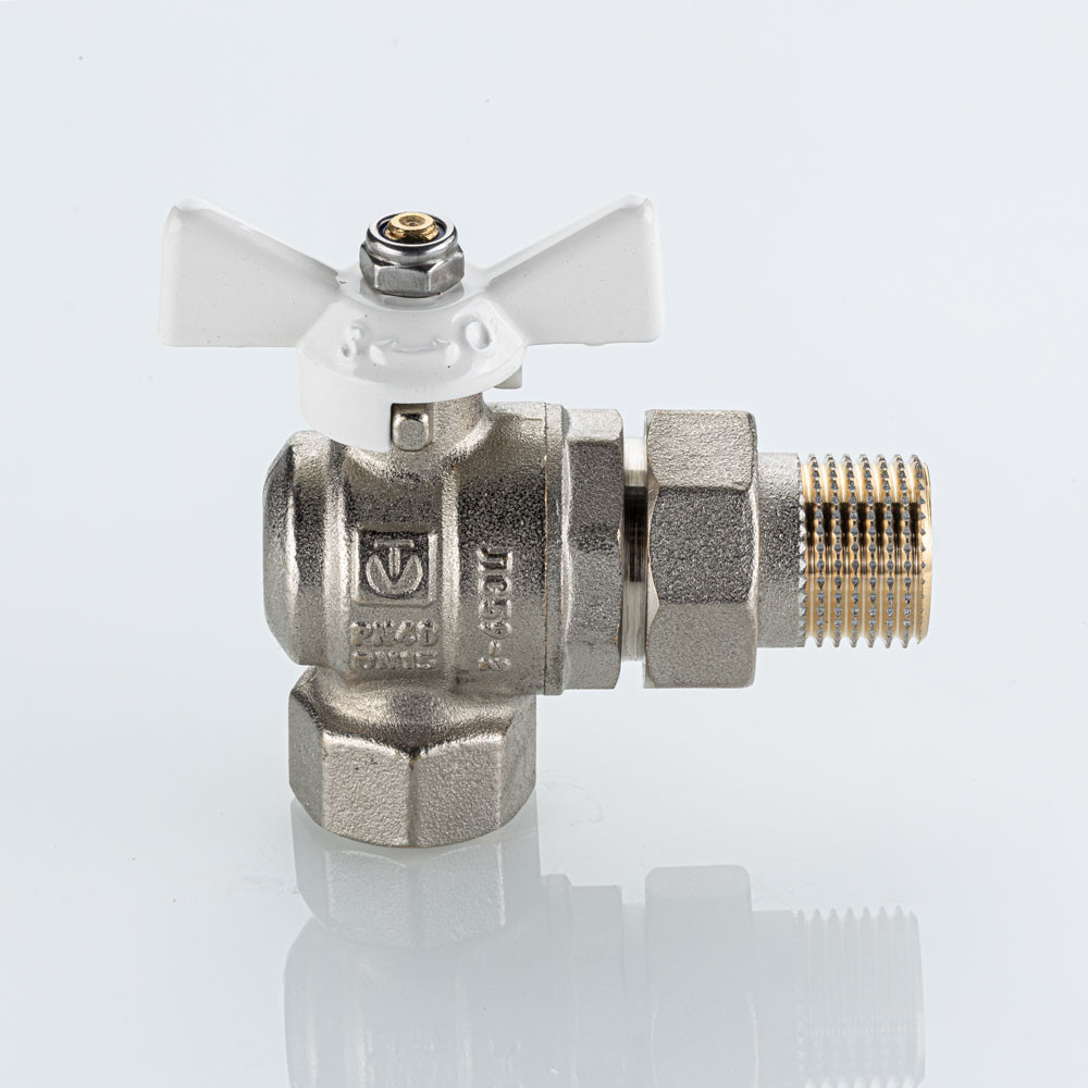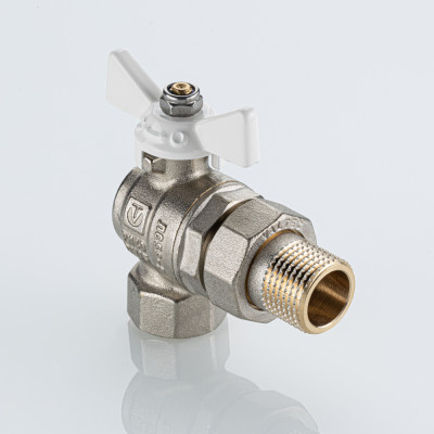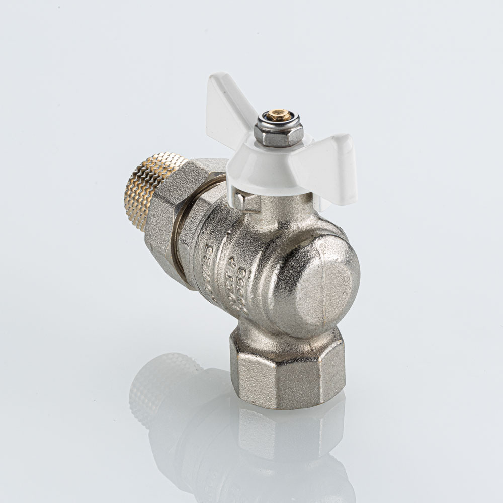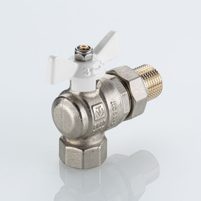 Полнопроходной угловой шаровой кран VT.228S.NW серии «BASE-ГОСТ» оснащен силуминовой ручкой-бабочкой с эпоксидной эмалевой окраской белого цвета и полусгоном. Резьба присоединений – внутренняя/наружная.