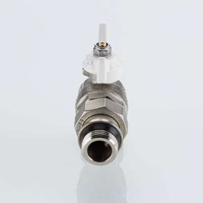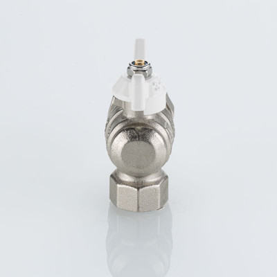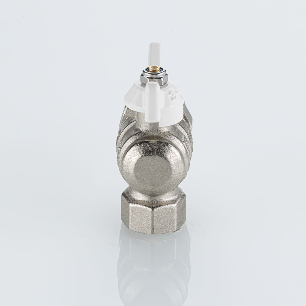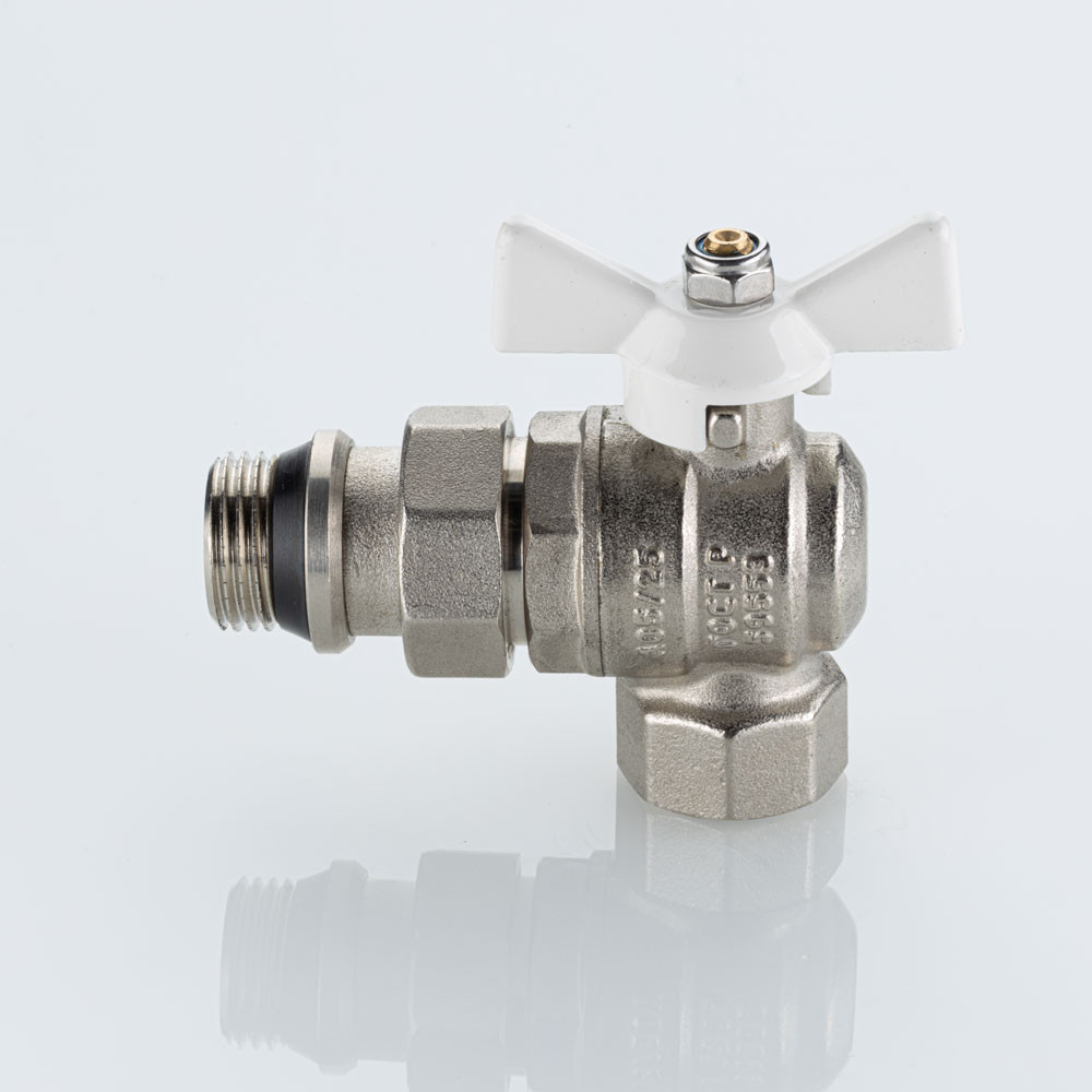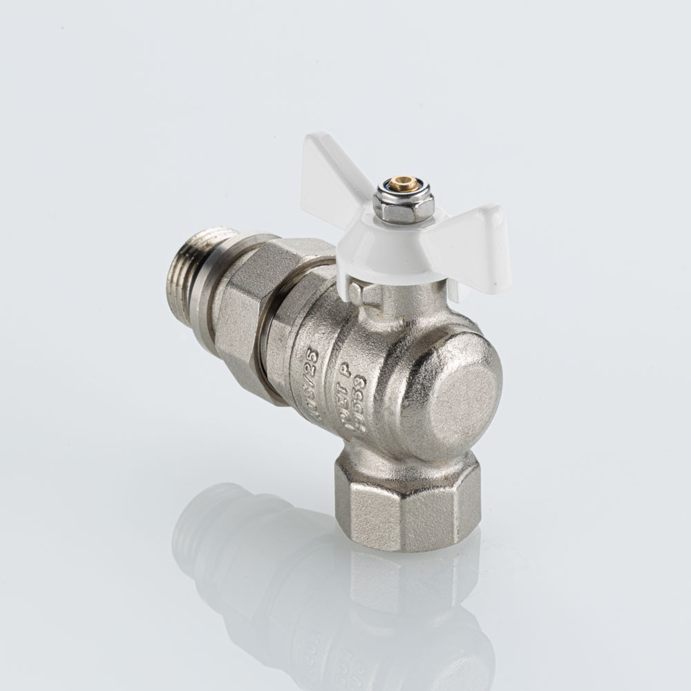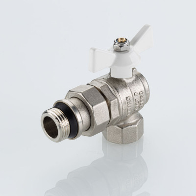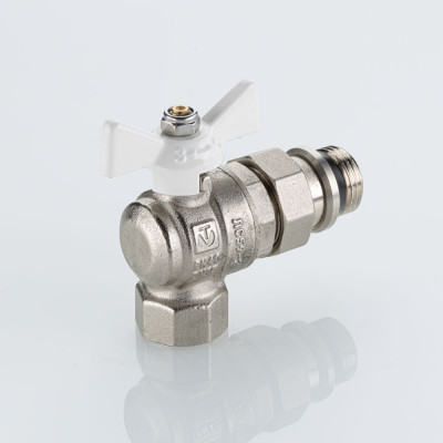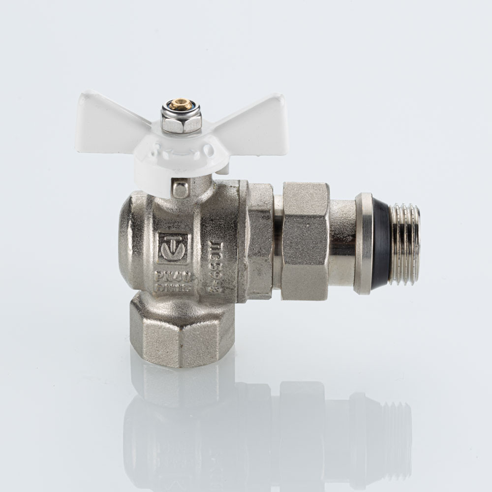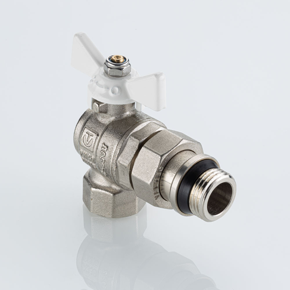 Полнопроходной угловой шаровой кран VT.228S.NRW серии «BASE-ГОСТ» оснащен силуминовой ручкой-бабочкой с эпоксидной эмалевой окраской белого цвета и полусгоном c уплотнительным кольцом из EPDM. Резьба присоединений – внутренняя/наружная.