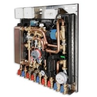 Жилой комплекс «Шишкин Лес» в Москве. Комбинированные квартирные станции размещаются в нишах поэтажных коридоров, которые оборудованы дверцей для доступа к обслуживанию. В комплектацию узла входит вся необходимая запорная и балансировочная арматура, для увязки между собой систем одной квартиры с системой всего дома.